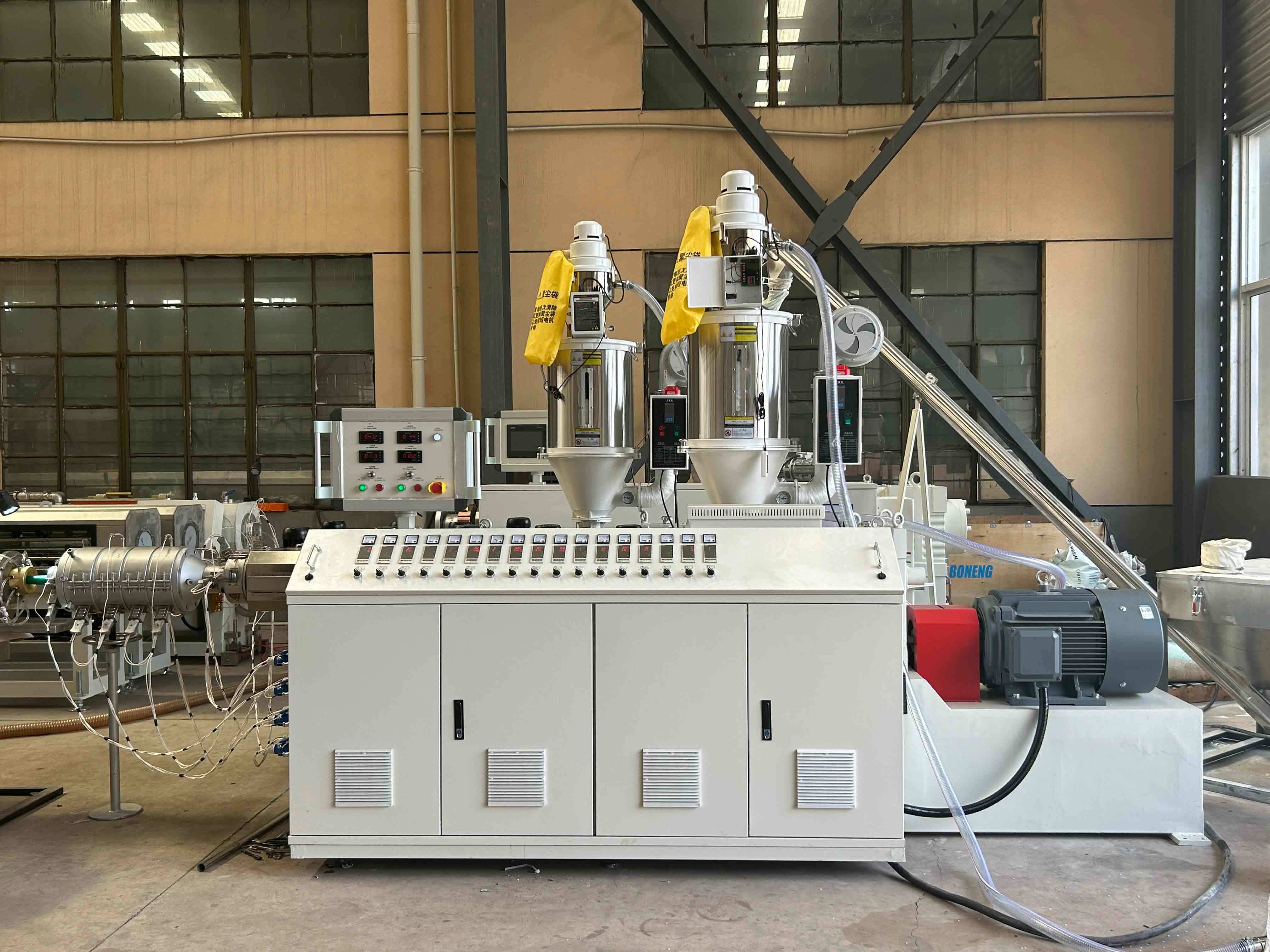 Les matières premières (granulés PPR/PVC, additifs) sont automatiquement introduites dans la trémie et mélangées uniformément.