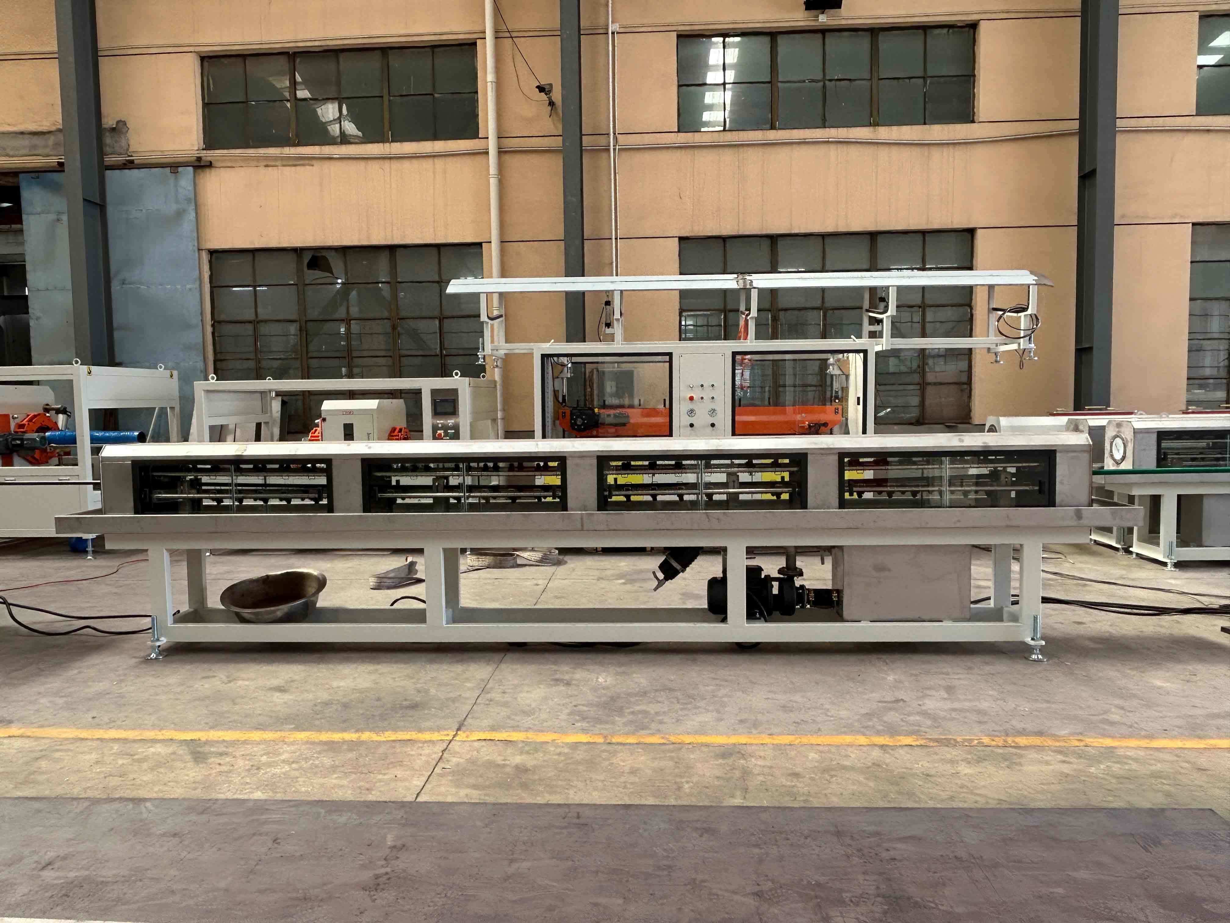 Le plastique fondu passe à travers une filière pour former des tuyaux/profilés, puis entre dans un réservoir d'étalonnage sous vide pour un dimensionnement et un refroidissement précis.