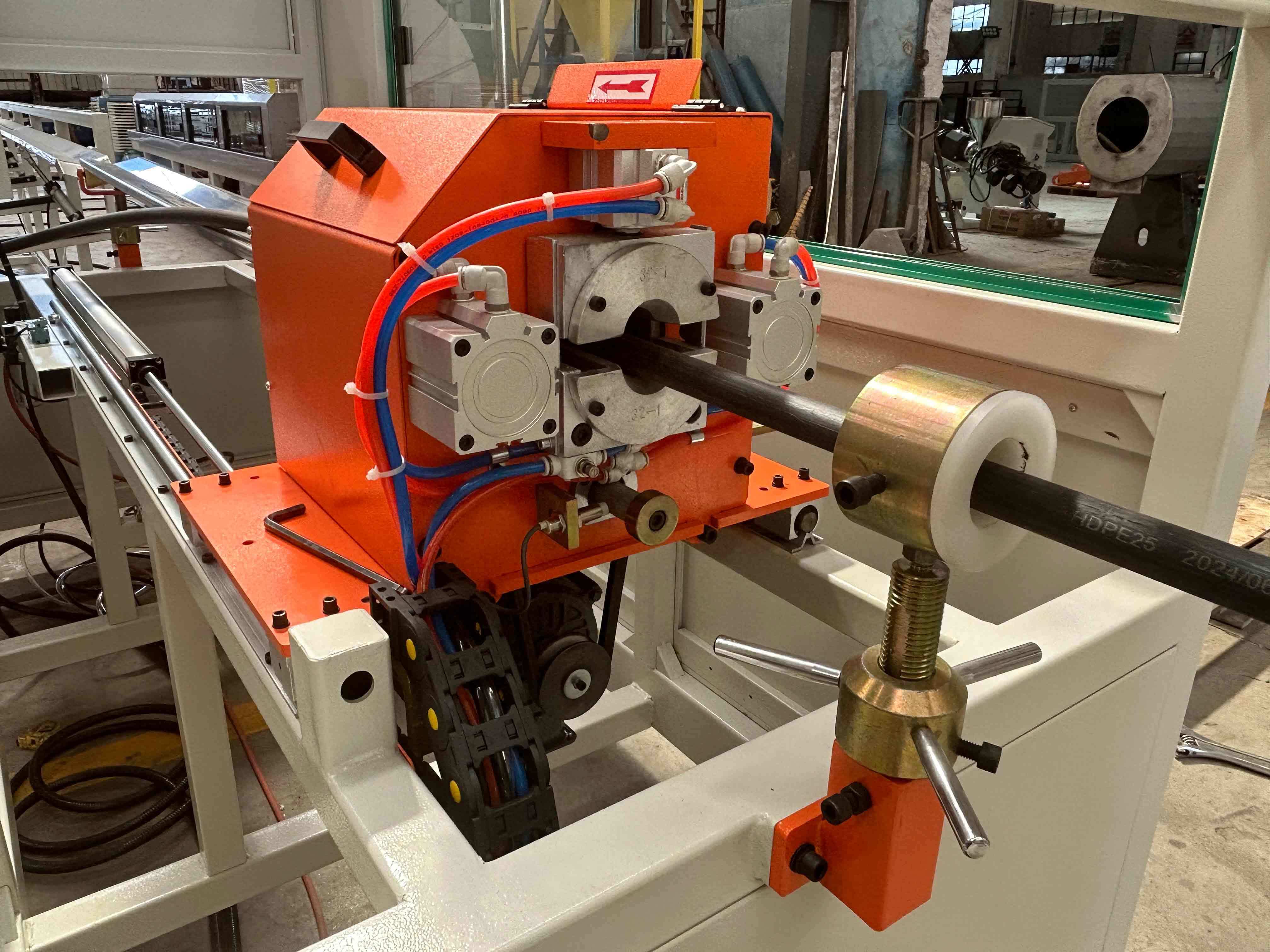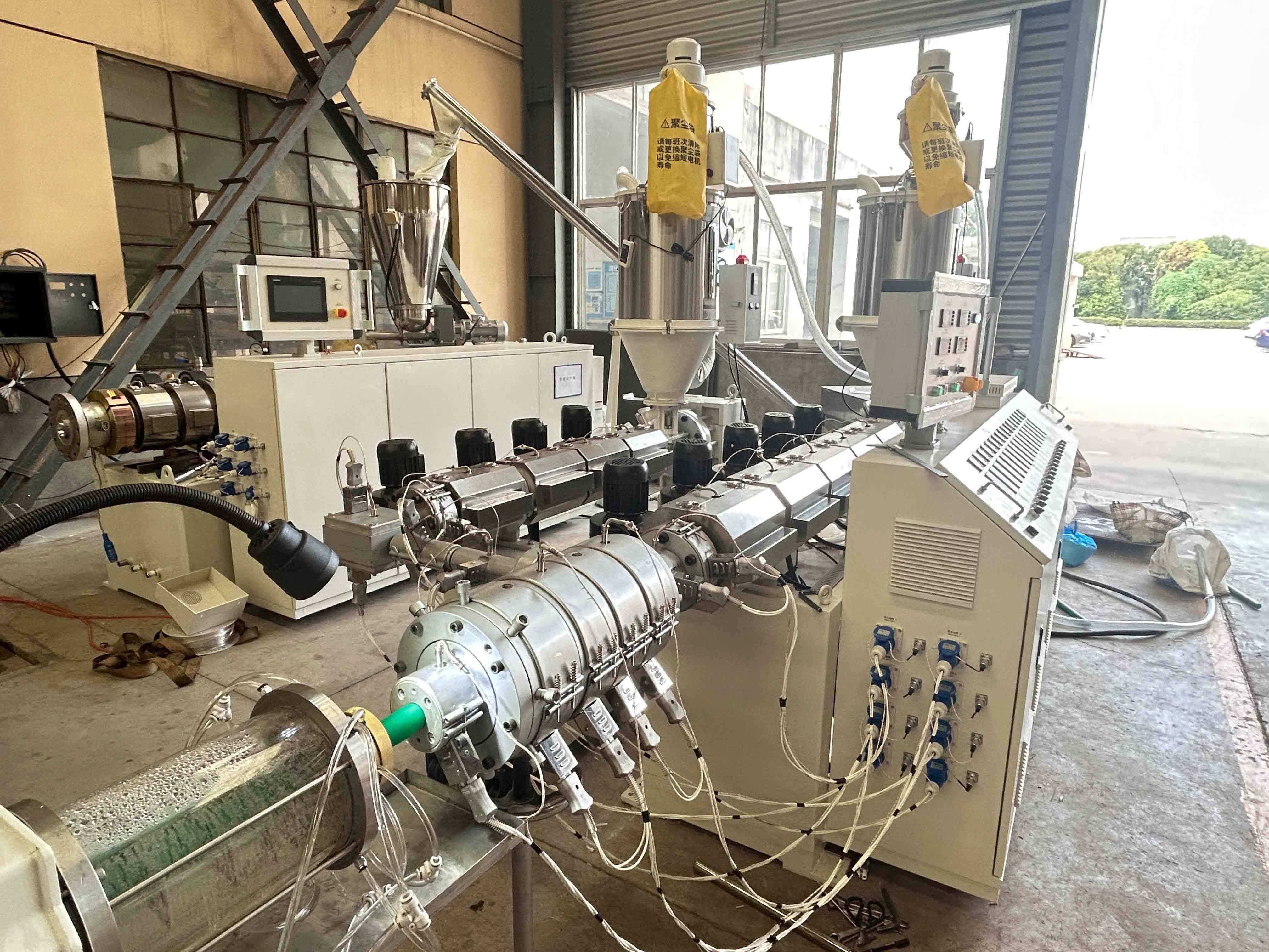 Matériau →Mélangeur de couleurs →Alimentation du matériau →Extrudeuse à vis unique →Mole et calibrateur d'extrusion → réservoir de refroidissement d'étalonnage sous vide → réservoir de refroidissement par pulvérisation →Imprimante → Unité de détachement →coupeuse →empileur ou bobineuse