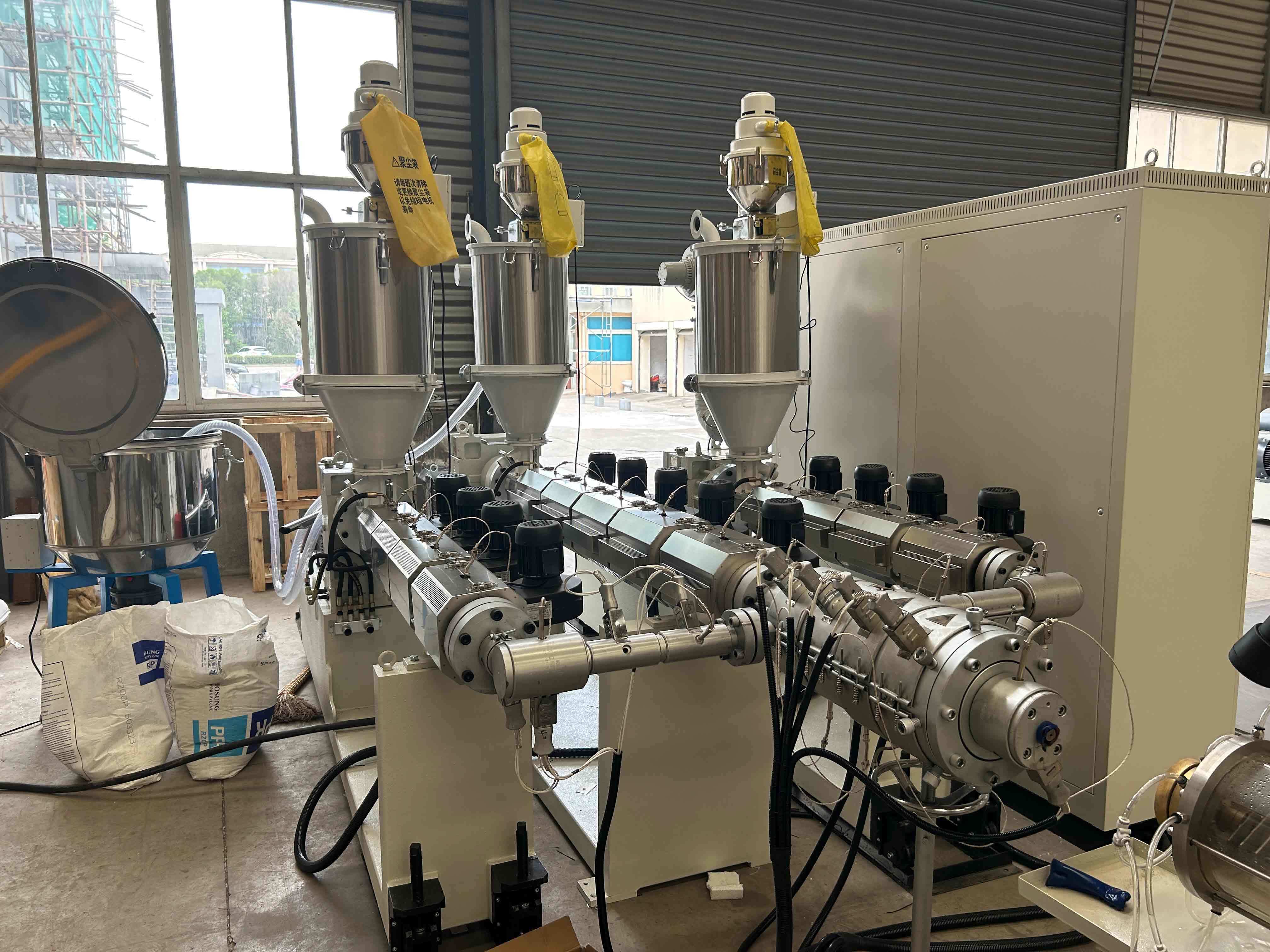 Les matières premières (pellets PPR/PVC, additifs) sont automatiquement introduites dans la trémie et mélangées uniformément.